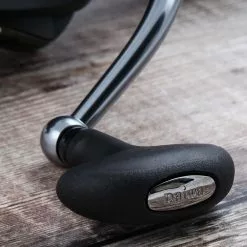 The 45mm spool has been double anodized in dark gunmetal and the tailgate features a toned-down finish called twilight. Even the wooden handle has been upgraded to a soft grip urethane knob!